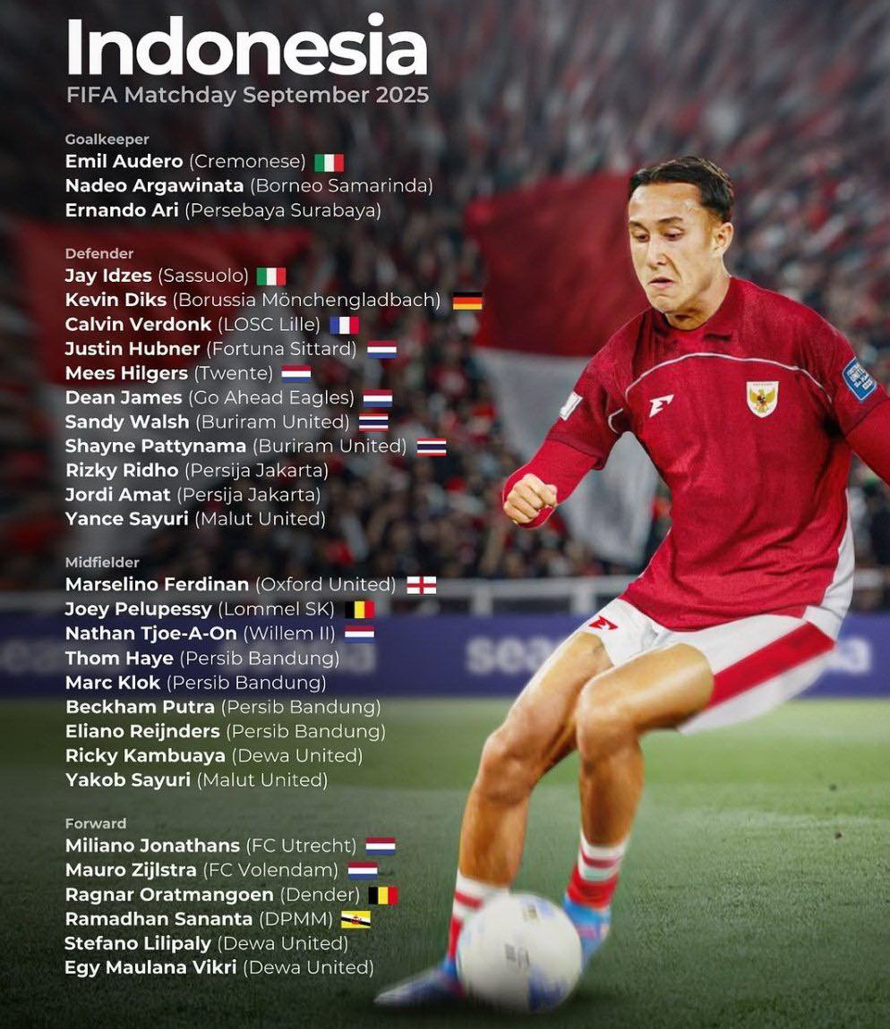 Jelang uji coba ini, Timnas Indonesia mendapat amunisi anyar, yakni Miliano Jonathans yang telah menyelesaikan proses naturalisasi menjadi WNI pada Rabu (3/9/2025).